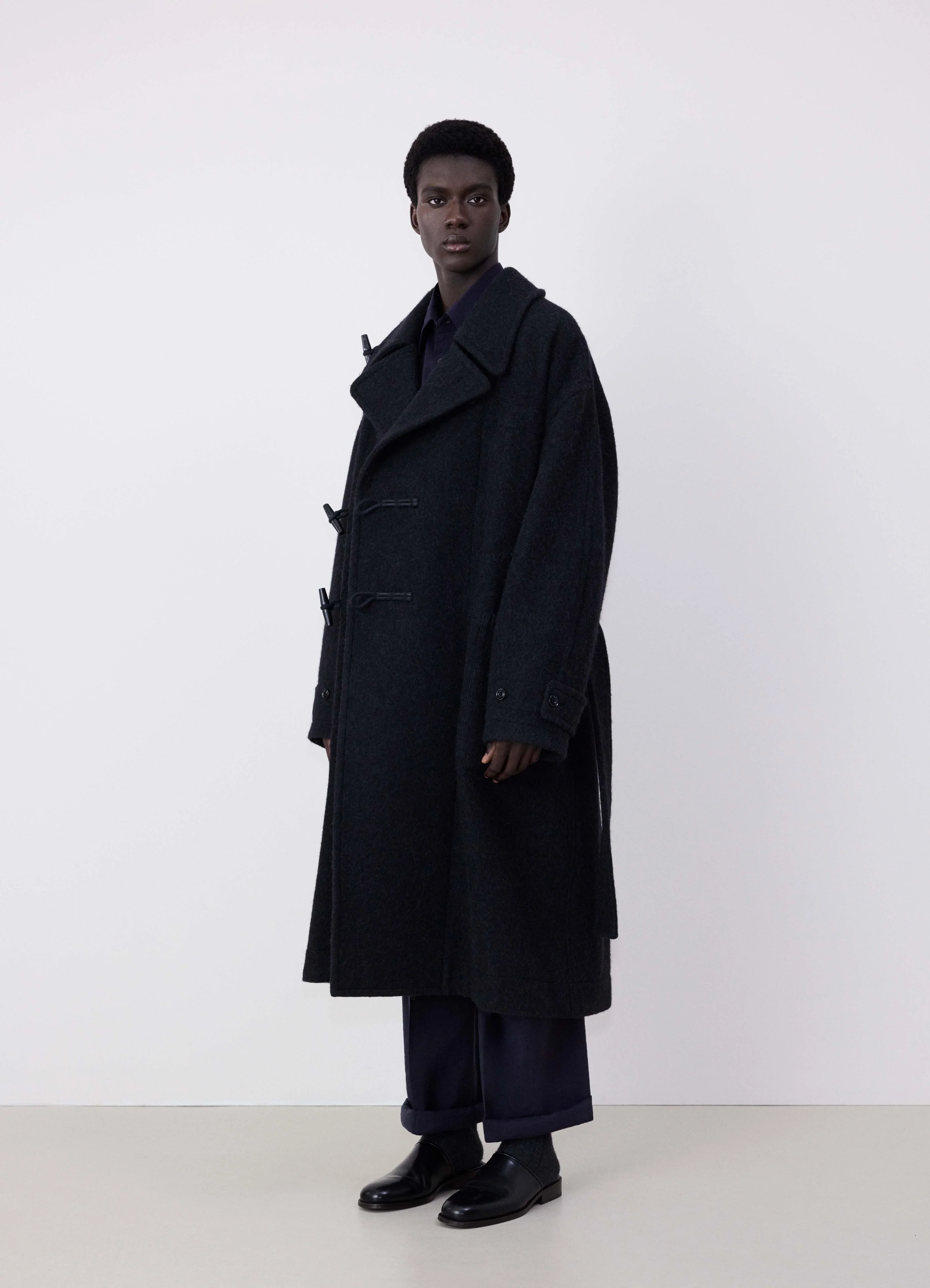 This garment is the long and oversize version of LEMAIRE's Short Duffle coat. Crafted from a luxurious wool and alpaca mix for a soft and warming feel, this belted piece features three wooden toggle closures on the right-hand side, an internal waxed cotton cordon, two patch pockets on the sides. It boasts a convertible collar, allowing for it to be worn either buttoned up or open, thanks to its classic double-breasted front design. This elongated silhouette features half raglan sleeves with adjusters on each cuff, inside patch pockets with topstitch details and a wide, sturdy leather loop on the back of the neck to hang it with ease.