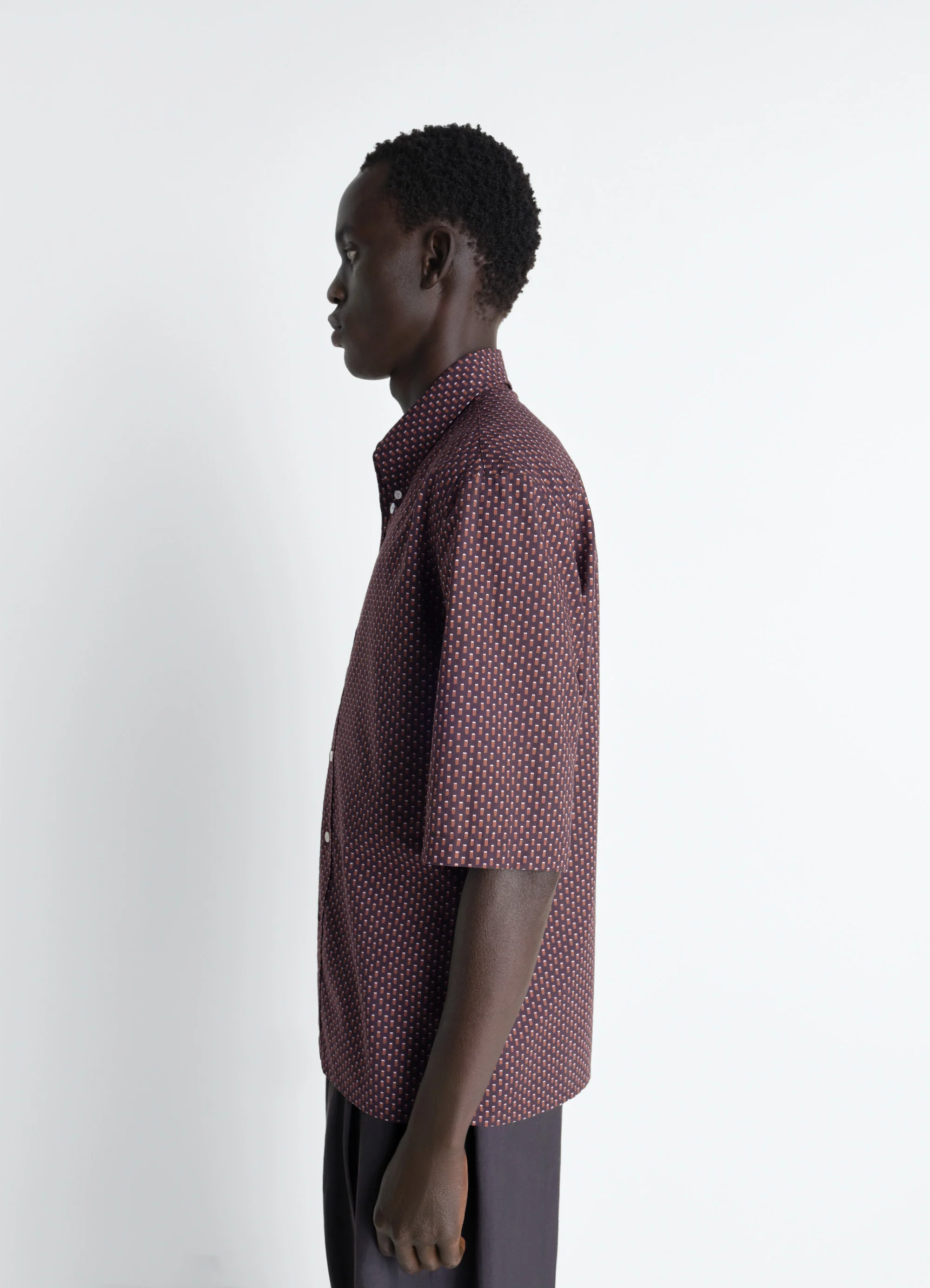 Inspired by LEMAIRE’s sense of comfort and sophistication, this classic shirt is made from refined geometric printed cotton. It features a button-down collar and a small loop along the front placket.