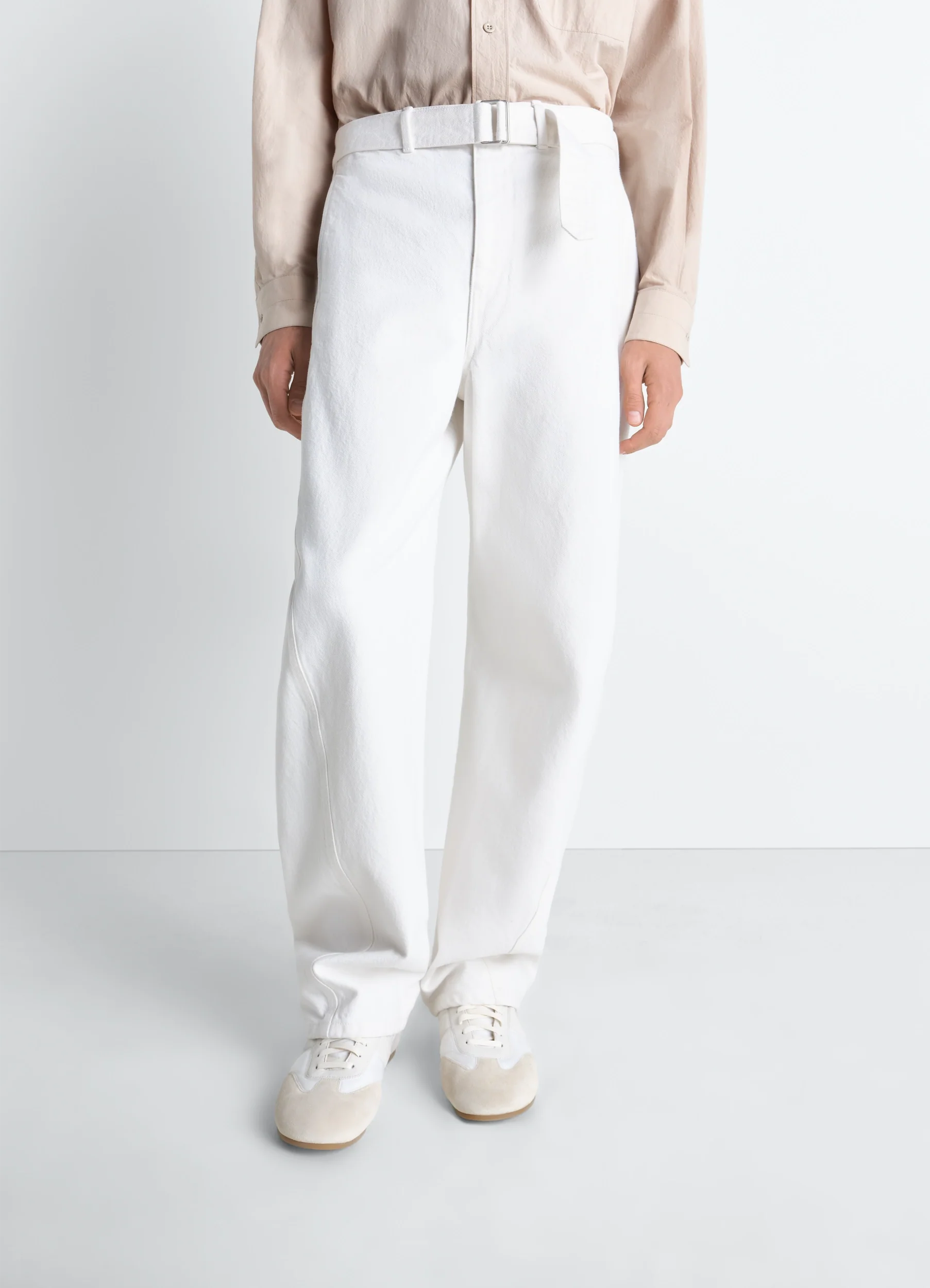 These belted Twisted trousers are a classic unisex LEMAIRE piece, with cut lines that round the leg and a removable belt. They are crafted from thick bleached denim with a light, worn-in effect.